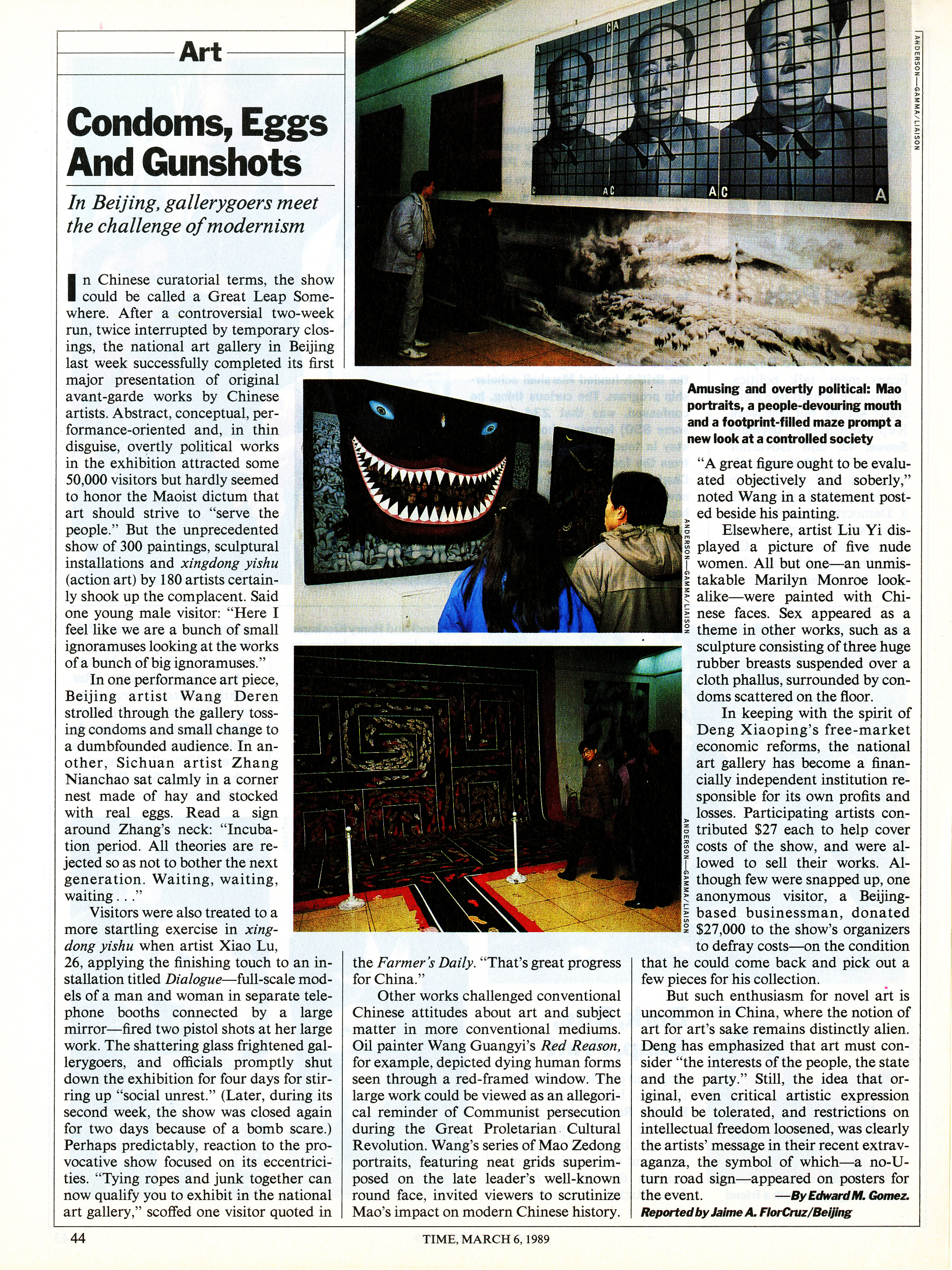 “Art: Condonms, Eggs and Gunshits: In Beijing, gallerygoers meet the challenge of modernism,” TIME International, Asia-Pacific edition, Mar. 6, 1989, page 44. Click here to open a PDF containing this complete article. |