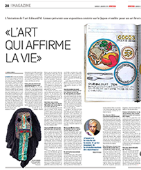 « L’art qui affirme la vie : L’historien de l’art Edward M. Gómez présente une exposition centrée sur le Japon et milite pour un art brut mieux intégré aux canons de l’histoire de l'art » , interview by Aurélie Lebreau with Edward M. Gómez on the occasion of the presentation of the exhibition L’Art Brut du Japon, un Autre Regard / Art Brut from Japan, Another Look at the Collection de l’Art Brut, Lausanne, Switzerland; published in La Liberté, a newspaper based in Fribourg, Switzerland, Jan. 5, 2019, pgs. 28-29; in French. See complete, published article here (PDF). |