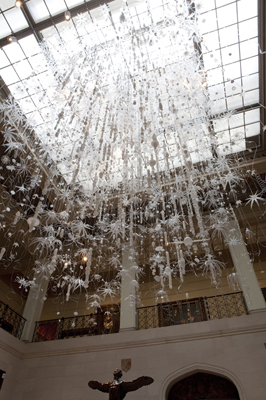 Sculptures on view in the conservatory exhibition include Kamilo, which was made from plastic trash that washed ashore on the southern point of Hawaii, and Be Like Water, a cascade of shimmering forms made from 9000 clear-plastic bottles and 80,000 bottle caps.