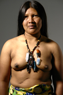 The Weight of Memory 1 (2007), a digital photographic print on vinyl-canvas by Erika Meza Gómez of Paraguay and Javier López Balboa, a Cuban who lives in Paraguay: Meza Gómez and López Balboa's large photo, measuring three meters in width by 4.5 meters in height, shows a bare-breasted Guaraní woman wearing a bead necklace from which numerous computer-memory sticks dangle like big, unlikely lucky charms. One of the more widespread, indigenous peoples of South America, the Guaraní can be found in a settlement area that stretches into what are now parts of Paraguay, Argentina, Uruguay, Bolivia and southern Brazil. Targeted for the slave trade centuries ago during the Spanish-colonial period, they have long faced persecution, especially in Paraguay. Meza Gómez and López Balboa's photographic image alludes to memory as the recorder and storehouse of a society's past, however painful it might be, and also to the power of both individual and collective memory to withstand the efforts of governments or powerful institutions to suppress or even wipe out a people's history, culture or existence. Posted by E.M.G. |