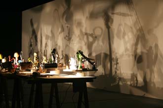 Above, left and right: Shadow Play, a mixed-media installation work by the German artist Hans-Peter Feldmann, on view in the "Making Worlds" exhibition at the 2009 Venice Biennale. In this work, shadows cast on a wall by toys, tools and household objects illuminated by simple lamps as they spin around on rotating discs overlap and create random patterns and an enchanting atmosphere. Photos by E.M.G. |