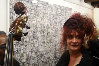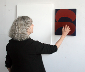 Above, left to right, recent works by Stephanie Brody-Lederman, including: Faire Courage (Blue Table) and Pink Cross, both dated 2010, both made with Sennelier inks on embossed glassine, mounted on paper, dimensions of both works 11 inches x 9 5/8 inches; All Those Good Years, 2012, 8 inches x 10 inches, acrylic and graphite on paper; and Regrets, 2012, acrylic and graphite on paper, 8 5/8 inches x 6 5/8 inches. Far right: The artist in her studio in New York, summer 2012. Photos of artworks by Bill Orcutt, courtesy of Stephanie Brody-Lederman Studio. Photo of the artist by E.M.G. |