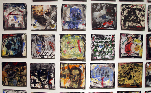 refined his stencil-painting technique. Now he uses acrylic modeling paste and enamel paint with his stencils to create the thick, crusty outlines of