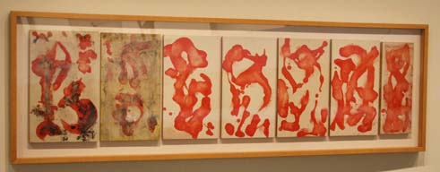 Above, a work on view in “The Third Mind”: Untitled (Red Painting 1-7), circa 1950, by Jackson Pollock; oil on canvas, in six parts, and enamel on canvas; smallest panel 50.8 x 20.3 cm; largest panel 53.3 x 33 cm. The exhibition argues that traditional East Asian calligraphy was one of the strongest influences, if not the greatest single influence, from Asia on several generations of American abstract artists. Photo by E.M.G. |