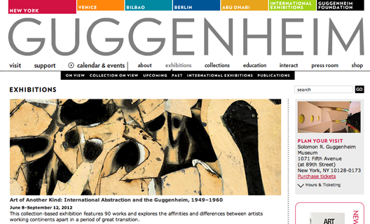 “Art of Another Kind: International Abstraction and the Guggenheim, 1949-1960” remains on view at the Guggenheim Museum in New York through September 12, 2012. (The screen shot from the museum’s website shows a detail from artist Conrad Marca-Relli’s “Warrior” (oil and canvas collage on canvas, 1956)).