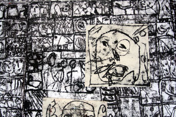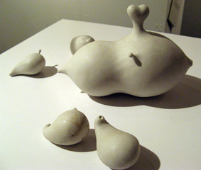 Overall, this year's Biennial offers fewer works of painting and sculpture than it does mixed-media works of a kind that could be described as "conceptualist" or perhaps "wannabe conceptualist." These days, around Latin America, especially in Mexico, a certain strain of what I call gimmick-driven, conceptualist or would-be conceptualist art-making is still very prevalent. Specifically, I'm referring to works whose one-trick plays on the meanings or values of certain appropriated objects or images - frying pans, baskets, cups and saucers, Q-tips, tortillas, supermarket shopping carts, newspaper photos, you name it - purport to provocatively subvert such meanings or values. Many such creations have little or no poetic or aesthetic resonance, however, and after a viewer "gets it" - the new meaning of a stack of dishes or an assemblage of dry tortillas or a familiar corporate or brand logo presented in an uncommon context - there is often little to go back and "get" again.