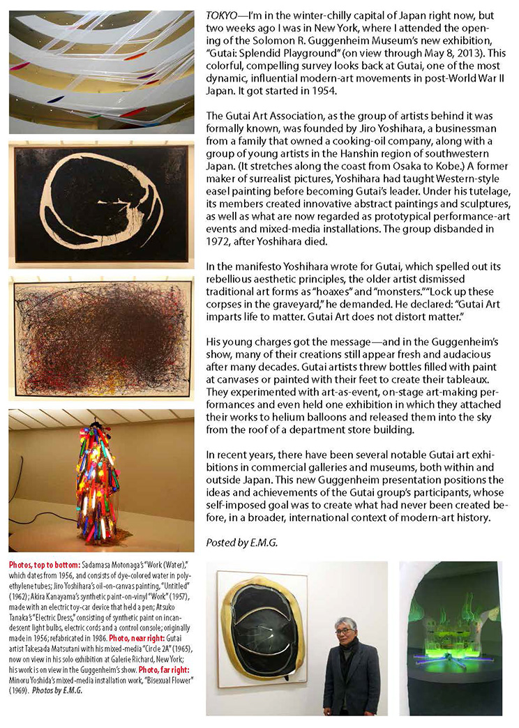 My article about the Solomon R. Guggenheim Museum’s new exhibition, “Gutai: Splendid Playground,” has just appeared in the Japan Times, the independent, national, English-language newspaper that is published in Japan. Read it on the newspaper’s website here. See a PDF that shows the print edition’s page layout by clicking here. Go Gutai!