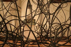 Prolongation (2007-2009), a mixed-media work by Colectivo Lalimpia: Consisting of a gas-station pump unit whose hose extends and unfurls endlessly, filling the exhibition space with a dense, impenetrable thicket of black-rubber tubing, this eloquently simple work by a five-person artists' collective from Ecudaor refers symbolically to the many, interconnected ways - economic, political, industrial - in which the oil industry and the use of petroleum-derived products effectively control the world - or at least the ways in which many people in it live, deeply dependent on such products.