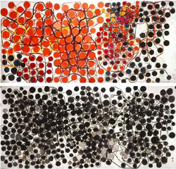 Above, left to right: Gutai artist Shozo Shimamoto's wooden sculpture, Please Walk On Here (1956), which invited viewers to walk across it, was first displayed in a public park; the front and back sides of Gutai artist Atsuko Tanaka's synthetic-paint-on-canvas painting, Work (1961), which is now owned by the Osaka City Museum of Modern Art in Japan; and the cover of the eleventh issue of the Gutai group's own, eponymous publication, which featured photos of its "International Sky Fetival," in which artworks were suspended from helium balloons that had been launched from the rooftop of a department store in Osaka. Photos courtesy of Solomon R. Guggenheim Museum's press office. |