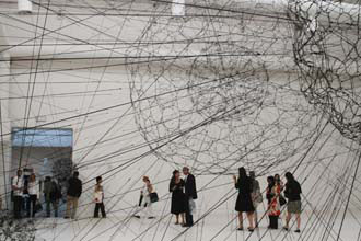 Above, left: A section of the Arsenale, the former ship-building center that houses a large portion of the 2009 Venice Biennale; above, center and right: the Argentine artist Tomas Saraceno's work, made of elasticized string, Galaxies Forming Along Filaments, Like Droplets Along the Strands of a Spider’s Web. Photos by E.M.G. |
