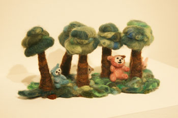 Oda makes mixed-media drawing-collages whose abstract imagery suggests dense constellations. Otsuka makes drawings and paintings with fine, fluid lines of young women and men in sexy poses. Mariko Suzuki creates both fine-lined drawings of imaginary worlds and also small-scale felt sculptures that she uses to illustrate children’s stories, and Yuko Suzuki makes what she calls “woodcut drawings” - 3-D, wall-mounted line drawings of not-so-innocent, innocent subjects (like a teddy bear that has been stabbed through the chest with giant pencils).