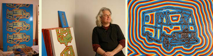 New paintings by Jon Waldo and the artist himself in his New York studio; painted with pop-art vigor and a nod to 1970s record-album design, these works celebrate the appeal of ordinary, everyday objects at a time when what is most basic in life might really turn out to have more lasting value than all that is over-hyped, over-priced and over-exposed in the media. Photos by E.M.G. |