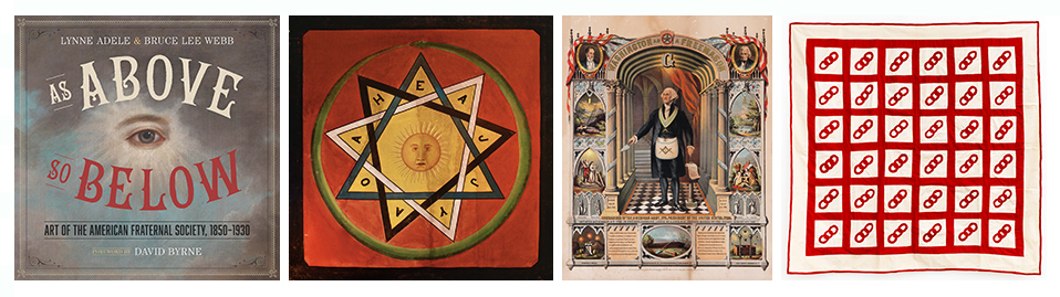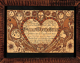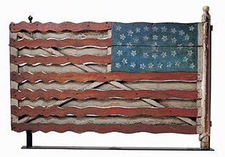 | Above, left to right: Logo of the current exhibition at the American Folk Art Museum in New York; David Cordier, Birth Record for Hana Oberholtzer, 1816, watercolor and ink on paper, 7 3/4 x 12 1/2 inches; uknown artist, Flag Gate, circa 1876, paint on wood, with iron and brass, 39 1/2 x 57 x 3 3/4 inches . Photos courtesy of American Folk Art Museum. |