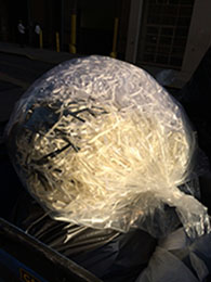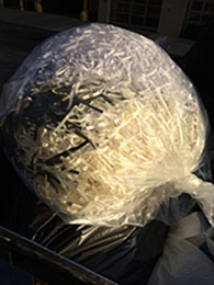 | Above, left to right: Clear-plastic trash bags, each one filled with shredded papers from offices, lying in a dumpster on West 20th Street in Manhattan in early July. Photos by E.M.G.. |