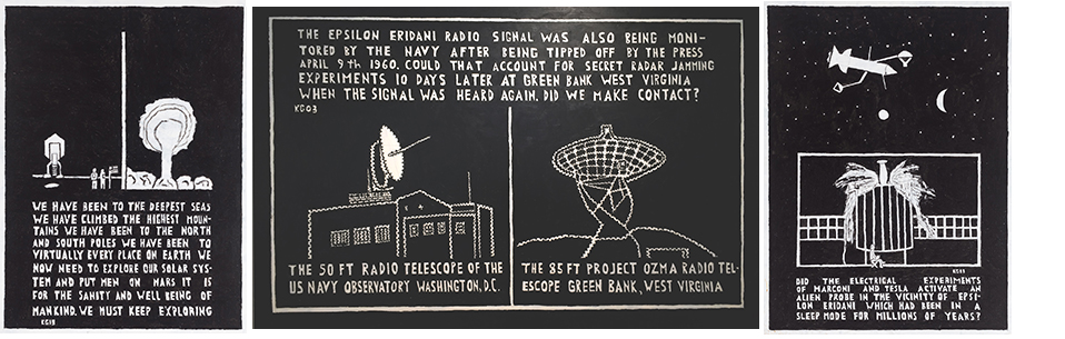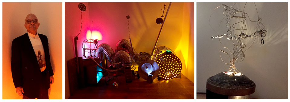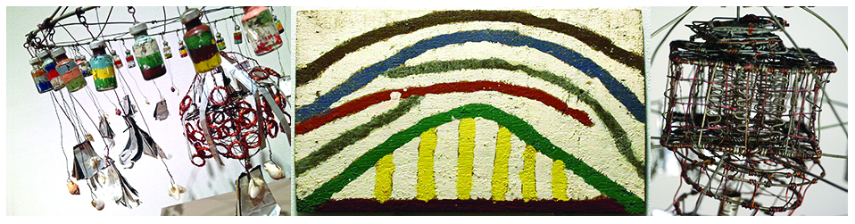 | Above, left to right: Various components from Emery Blagdon's larger, all hand-crafted "healing machine" creation, including a mixed-media, chandelier-shaped sculpture, an abstract painting on board and a box-like wire sculpture. First photo by Kelly Rush; photos in center and at right courtesy of Cavin-Morris Gallery, New York. |