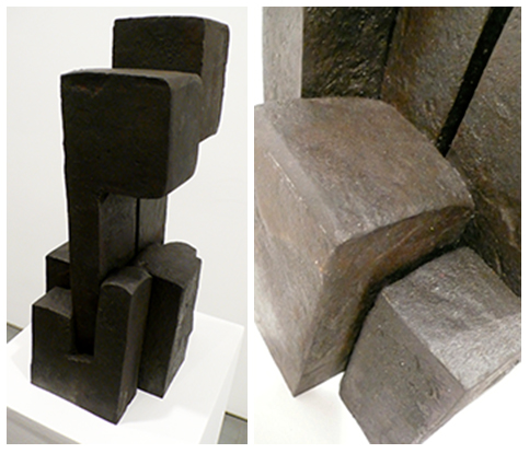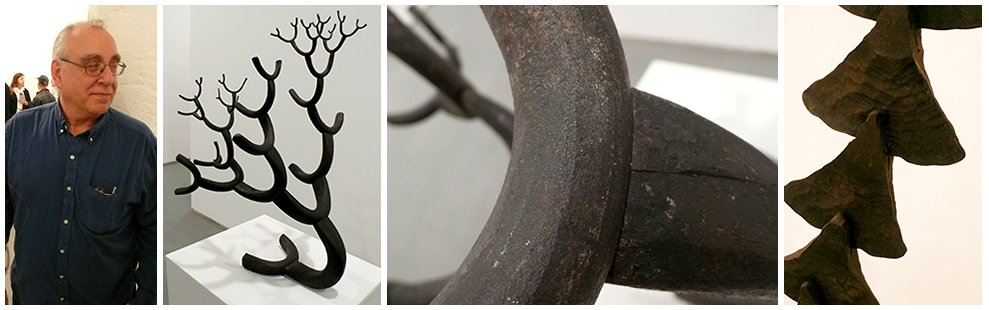 | Above, left to right: The sculptor John Crawford at the opening of his current exhibition at Lori Bookstein Fine Art on April 24, 2014; Bifurcation—Arches (2013), forged steel; detail of Bifurcation—Arches; detail of a tall, free-standing work, Tower 1 (2006), forged steel, showing the triangularly shaped elements of which it is composed. Below: Interlock 3 (2014), forged steel. Photos by E.M.G. |
