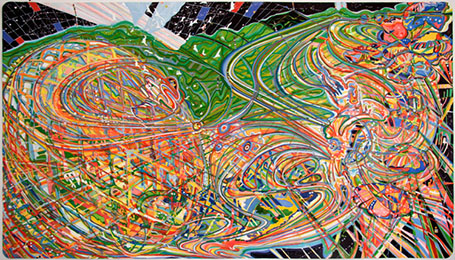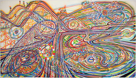| Above, left to right: Paintings by the artist Ati Miaier, including Giant Dipper (2010) and Savvy (2010). Dimensions of both works: 53 inches x 94.5 inches. Materials used to make both paintings: Airbrush and ink on paper. Photos courtesy of Pierogi. |
