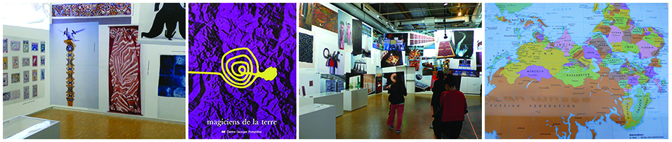 | Views of the current "'Magiciens de la Terre': Return to a Legendary Exhibition" exhibition at the Pompidou Center in Paris, in which big photos of the works that were presented in the original 1989 show cover the walls, and vitrines are filled with documents and background materials indicating how that innovative show's organizers carried out their research and decided which artists' works to include in it; cover of the original exhibition's catalog; and the Australian Stuart McArthur's Universal Corrective Map (1979), which reverses the usual cartographic positions of the Earth's northern and southern hemispheres. McArthur's map is on display in a vitrine in the current exhibition. It provided a major point of reference for the organizers of "Magiciens de la Terre," who sought to look at the world and its cultures in new, non-Eurocentric ways. Photos by E.M.G. |