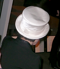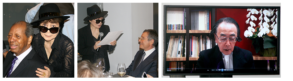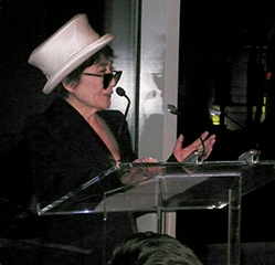 | Above, left to right: Artist Yoko Ono presiding at the podium at the presentation of the 2014 Courage Awards for the Arts in New York this past Sunday, Feb. 24, 2014; Ono’s white top hat; performance artist Laurie Anderson, one of this year’s laureates, at the awards ceremony.. Photos by E.M.G. |