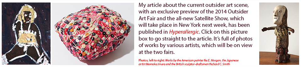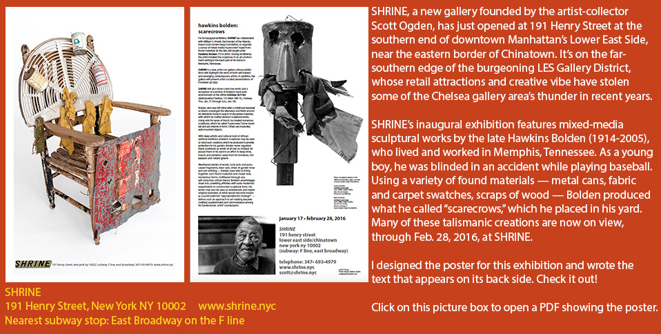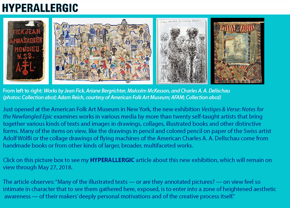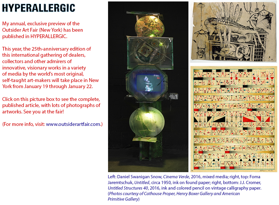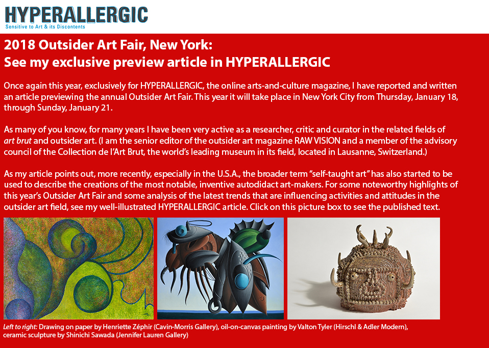 Click on the picture box, above, or click here to see my HYPERALLERGIC article about the 2018 Outsider Art Fair, New York.