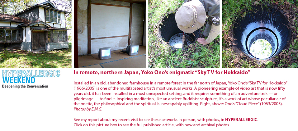 A fe days ago, I traveled to the island of Hokkaido in the far north of Japan, where I visited a little-known and rarely seen video-installation work by the artist Yoko Ono, her “Sky TV for Hokkaido” (1996/2005), which was set up in an old, abandoned farmhouse in the Tokachi Millennium Forest in 2005. My article about this unusual artwork and its unexpected setting has been published in HYPERALLERGIC. Click here to see this article, with many photos. (See the picture box at the top of this home page, too.)