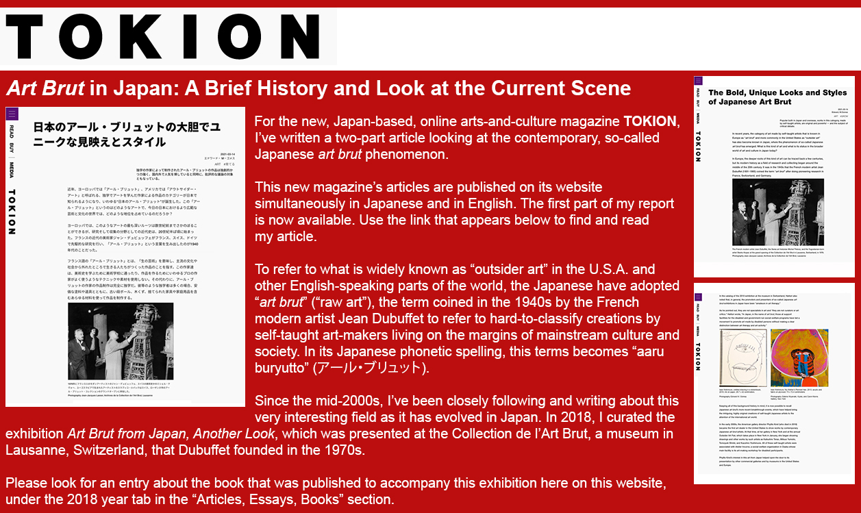 私のTOKION文化雑誌に掲載された日本のアール・ブリュットについての記事を日本語で読むためにこちらをご覧ください。.pdfファイルです。