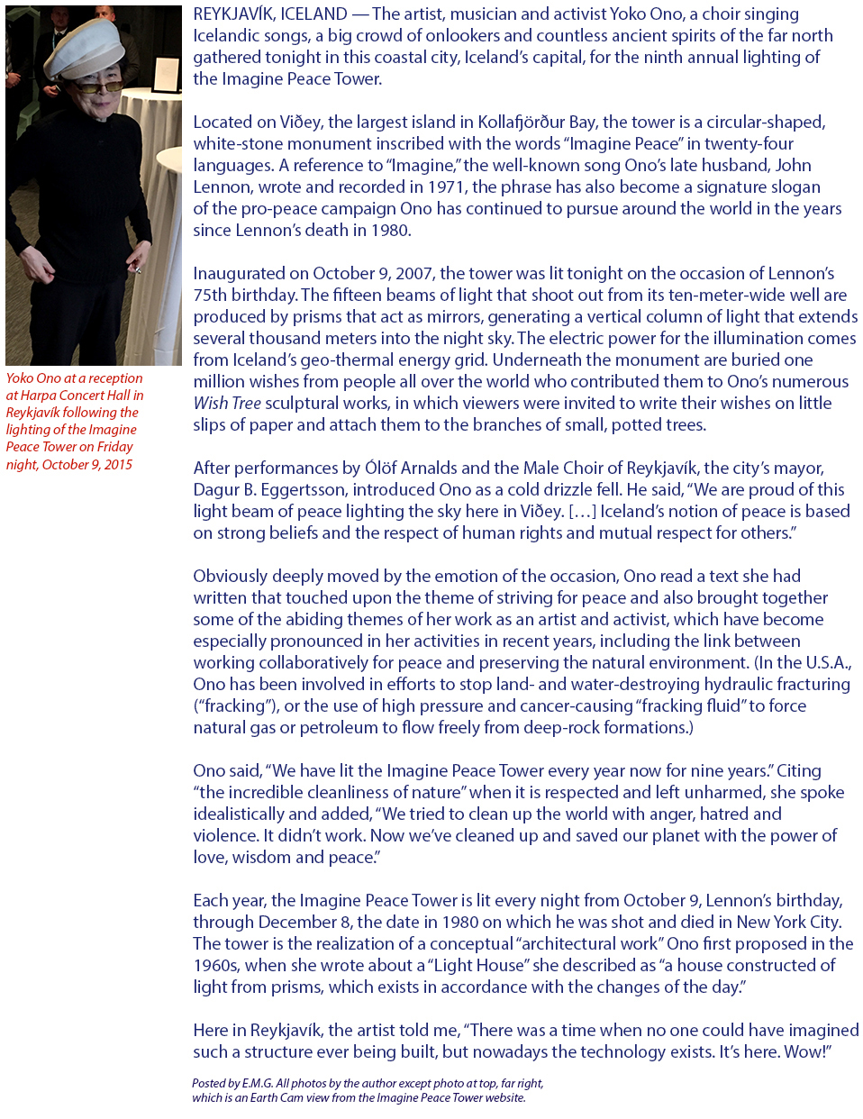 With such themes in mind, Ono’s Courage Awards acknowledge the achievements and the stick-to-itiveness of art-makers, music-makers, creative visionaries and determined champions of free expression, that indispensable, basic human right that allows creativity to flow. Past recipients of the awards have included, among others, WikiLeaks founder Julian Assange; the feminist artist, writer and activist, Kate Millett; composer-performer Meredith Monk; the Guerrilla Girls; composer-performers La Monte Young and Marian Zazeela; and the 19th-century writer Émile Zola. (In fact, PEN American Center, the organization that supports writers and freedom of expression, picked up Zola’s 2010 award for him in that long-deceased author’s name.) Each award consists of a framed certificate and a check in the amount of $25,000.00.