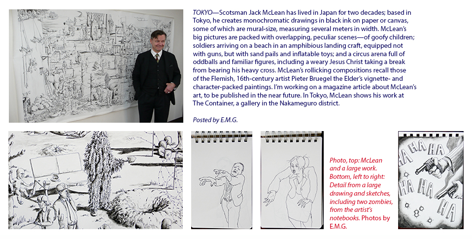 NEW YORK — A few months ago, in Tokyo, I met the Scottish-born artist Jack McLean, who has lived and worked in Japan for two decades and who sometimes likes to dress up as a tree. In my just-published article about McLean’s art and ideas in the April issue of the American art magazine Art & Antiques, you can read about his unusual drawings in ink on paper or canvas, and about how packed they are with overlapping, weird-funny scenes and goofy characters. You might even recognize some of the neurotic urban types and 21st-century zombies McLean depicts in his visual offerings of the human comedy in all of its self-absorbed, head-turning, gadget-obsessed, curse- and laughter-inducing splendor. See a PDF containing the published pages of this magazine article here. McLean is represented by The Container, a gallery in Tokyo. |