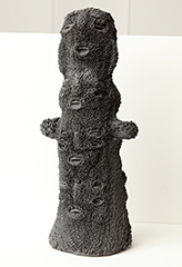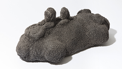 An excellent selection of Kamae’s works is now on view, through June 20, 2014, at Yukiko Koide Presents, a gallery in Tokyo that specializes in works made by self-taught artists. The exhibition, Kazumi Kamae: Masato, My Love, offers a good overview of the expressive range of Kamae’s art. Some of the sculptures on view are semi-abstract, totem-like forms with stubby arms and multiple eyes and mouths. Others seem to slouch like strange animals in repose. Kamae meticulously covers her sculptures with short, thick daubs of clay that resemble three-dimensional brushstrokes. From a distance, her works appear to be covered in fluffy pelts, belying the hard, crusty character of their surfaces. The artist’s remarkably skillful transformation of her humble material and the unusual aura of her creations contribute in a big way to her work’s allure.