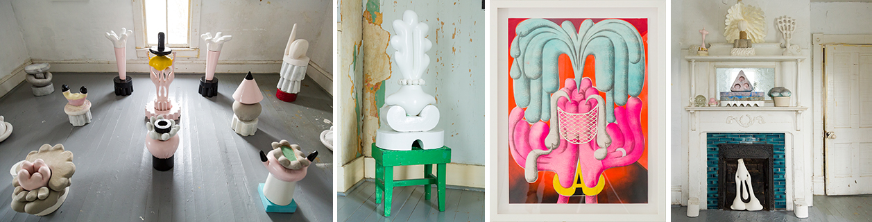 His sculptures bring to mind dildos; plump, gloved hands; bunny rabbits’ ears; cows’ udders; and the shoulders and smooth curves of fiberglass or plastic display-window mannequins.