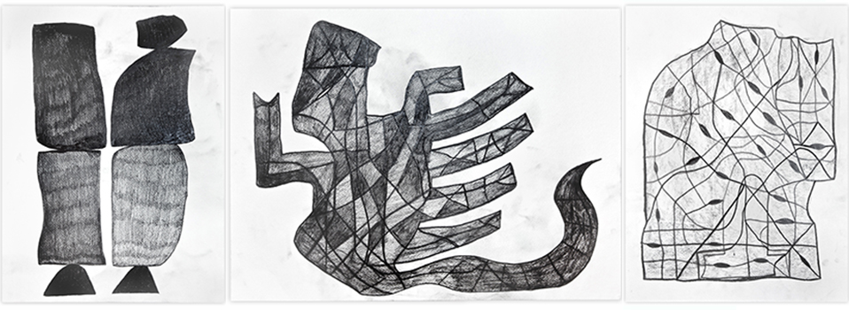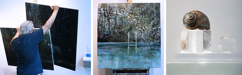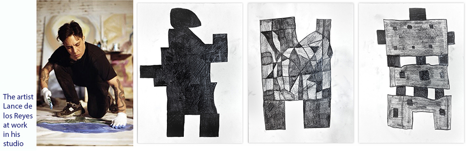 | Left to right: The artist Domenico Zindato, in New York, with drawings from the suite 31 (2014-2015); three works from 31: This World is Small as a Grain of Dust, Into the Water's Music and Do Not Ask How It Came About This Creation; all three works dated 2015, ink and pastel on paper; each work measures 16 by 10 inches (photo of the artist by E.M.G.; photos of artworks courtesy of Domenico Zindato and Andrew Edlin Gallery) |