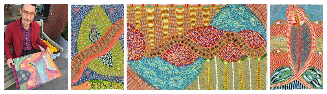 In our interview conversation, the artist referred to what he described as a “spiritual” or “mystical” aspect of his art and art-making process, of which he is very much aware. He told me that he believes that viewers who examine his drawings “activate them with their own energy.” He said, “Through the art, together we share in a kind of blissful communication, a dynamic circulation of energy.”
